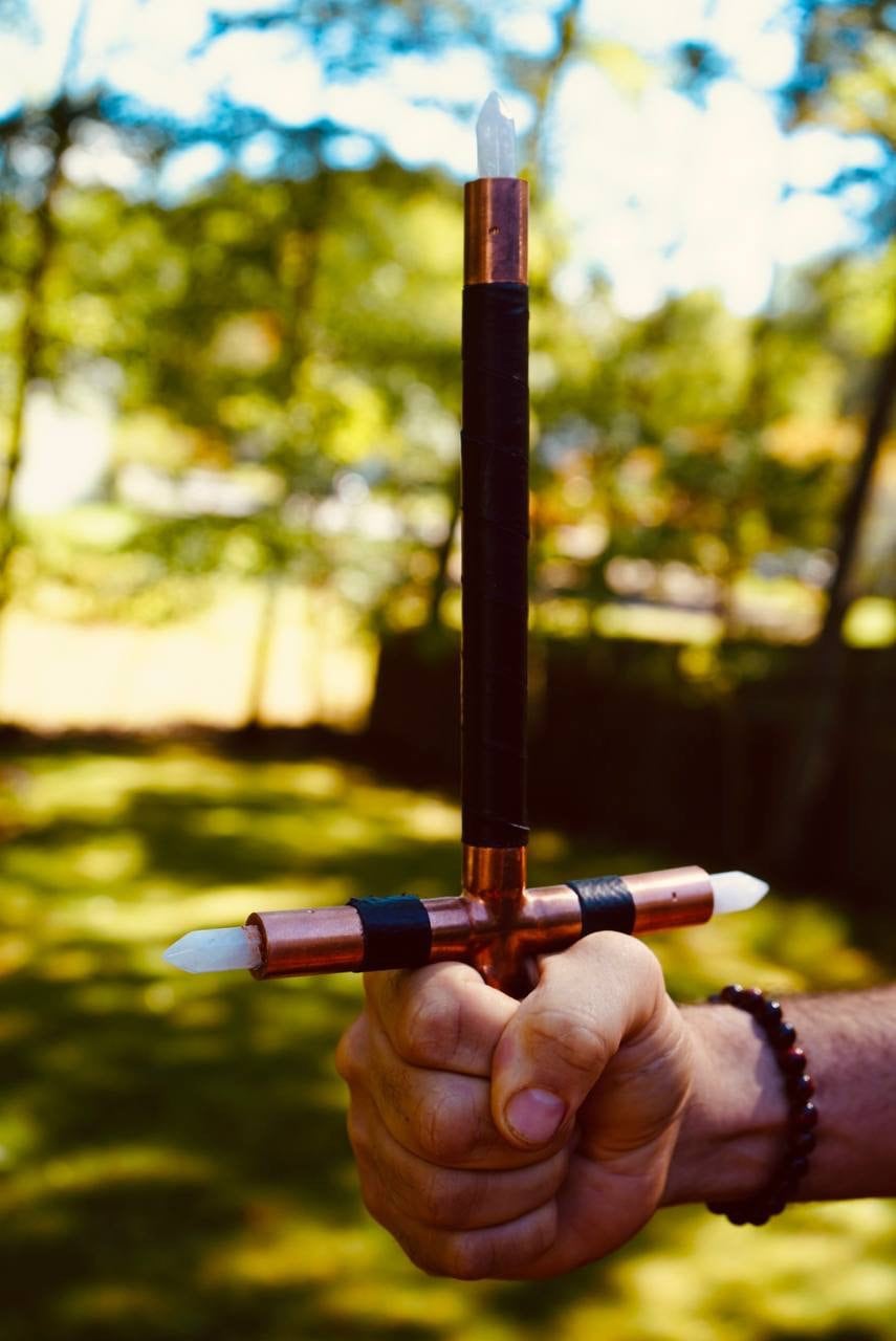 Another position that can be used, particularly for healing, is to hold the shorter top arm in your hand like a sword grip, with the energy beam emitting through the crystal end of the long arm and energy from the three short arms surrounding you.